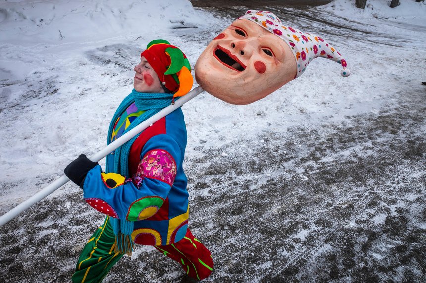 Street performer in a suit of Petrushka character is walking down the street with a huge mask during Maslenitsa carinval, Russia Model release